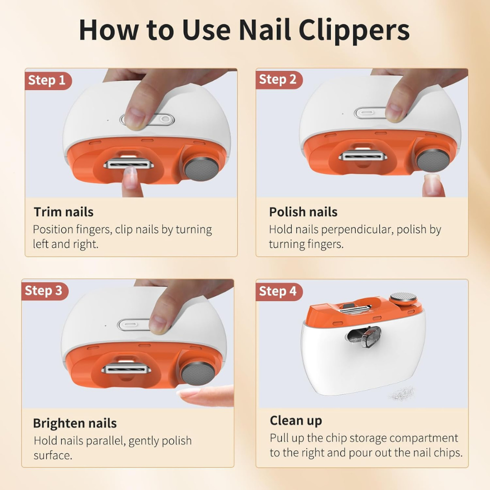 LED LIGHT & ULTRA-QUIET PERFORMANCE : Equipped with a soft LED light that illuminates the nail area for better visibility and accuracy. The low-noise motor (~45 dB) ensures a calm, stress-free experience—so quiet it can even be used while a baby sleeps.